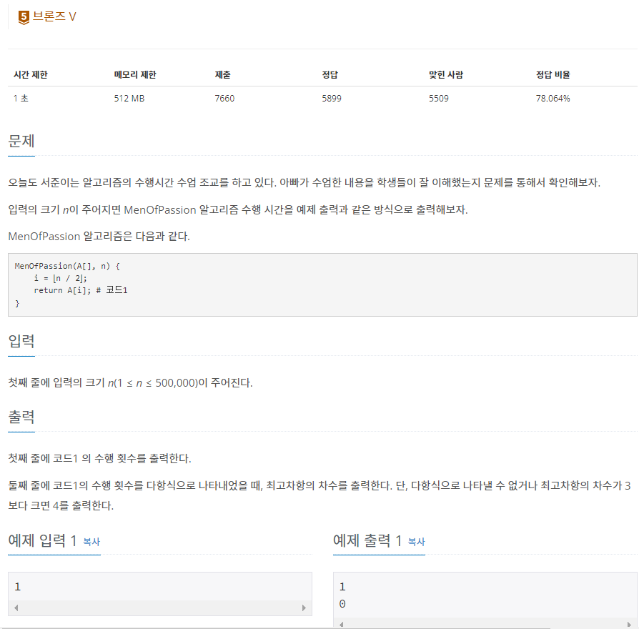 둘째 줄에는 코드1의 수행 횟수를 다항식으로 나타냈을 때 최고차항의 차수를 출력하라고 하네요.