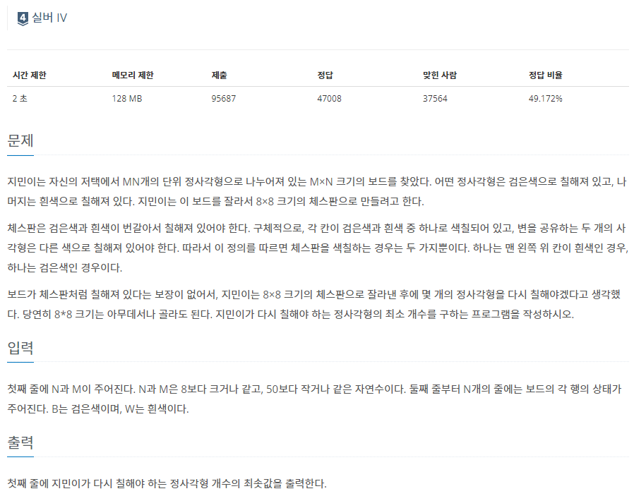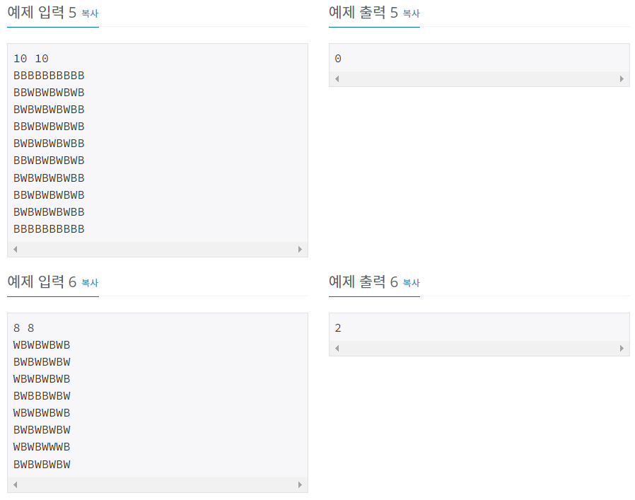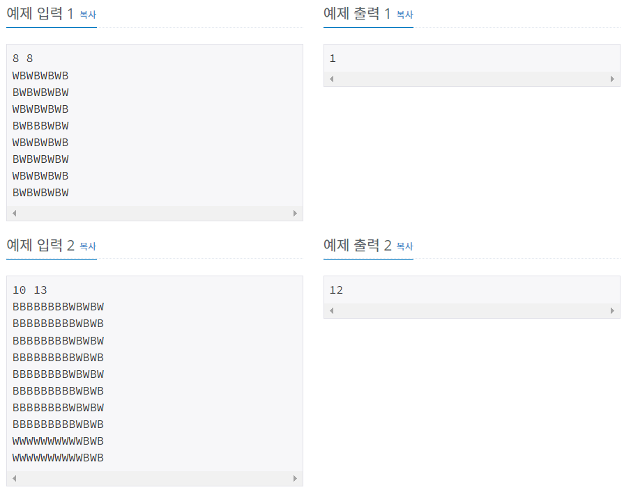 - k for문은 맨 왼쪽 위 칸이 흰색인 경우와 검은 색인 경우 2가지 모두 체크해줘야 하기 때문에 필요하다.
