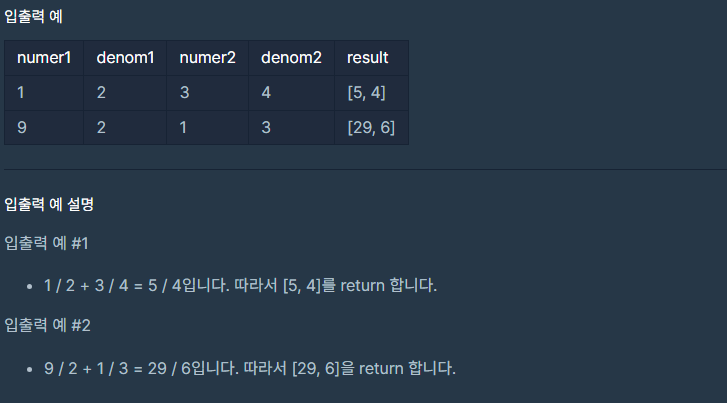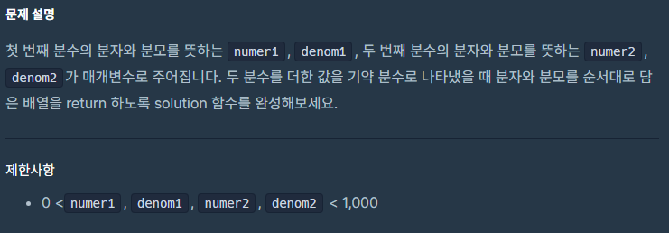 예를 들어 1/2 + 1/2를 할 경우 제 코드는 [2, 2]를 반환하지만 기약 분수로 변환하면 [1, 1]이 나오는게 정답입니다.